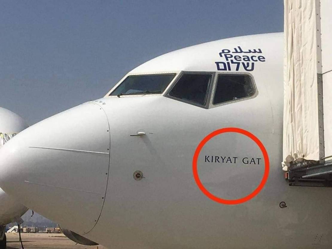 الطائرة التابعة لشركة "إل العال" الإسرائيلية، التي أقلعت تجاه أبو ظبي، ظهر عليها اسم مستوطنة "كريات جات"، المقامة على الأراضي بين قريتي الفالوجة وعراق المنشية المهجرتين.