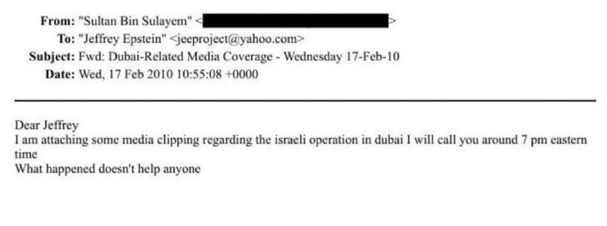 ولاحقا للكشف عن مراسلات خاصة لإبستين تمتد لأكثر من عقد، تروي قصة علاقته الوثيقة مع الرئيس النافذ لإمبراطورية "موانئ دبي العالمية"، سلطان أحمد بن سليم، المرتبط ارتباطاً وثيقاً بالعائلات الحاكمة في الإمارات، جاء في الوثائق المنشورة، رسالة إلكترونية من سلطان أحمد بن سليم إلى جيفري إبستين تشير إلى تورط إبستين في اغتيال الموساد للقيادي في حركة حماس محمود المبحوح في دبي.