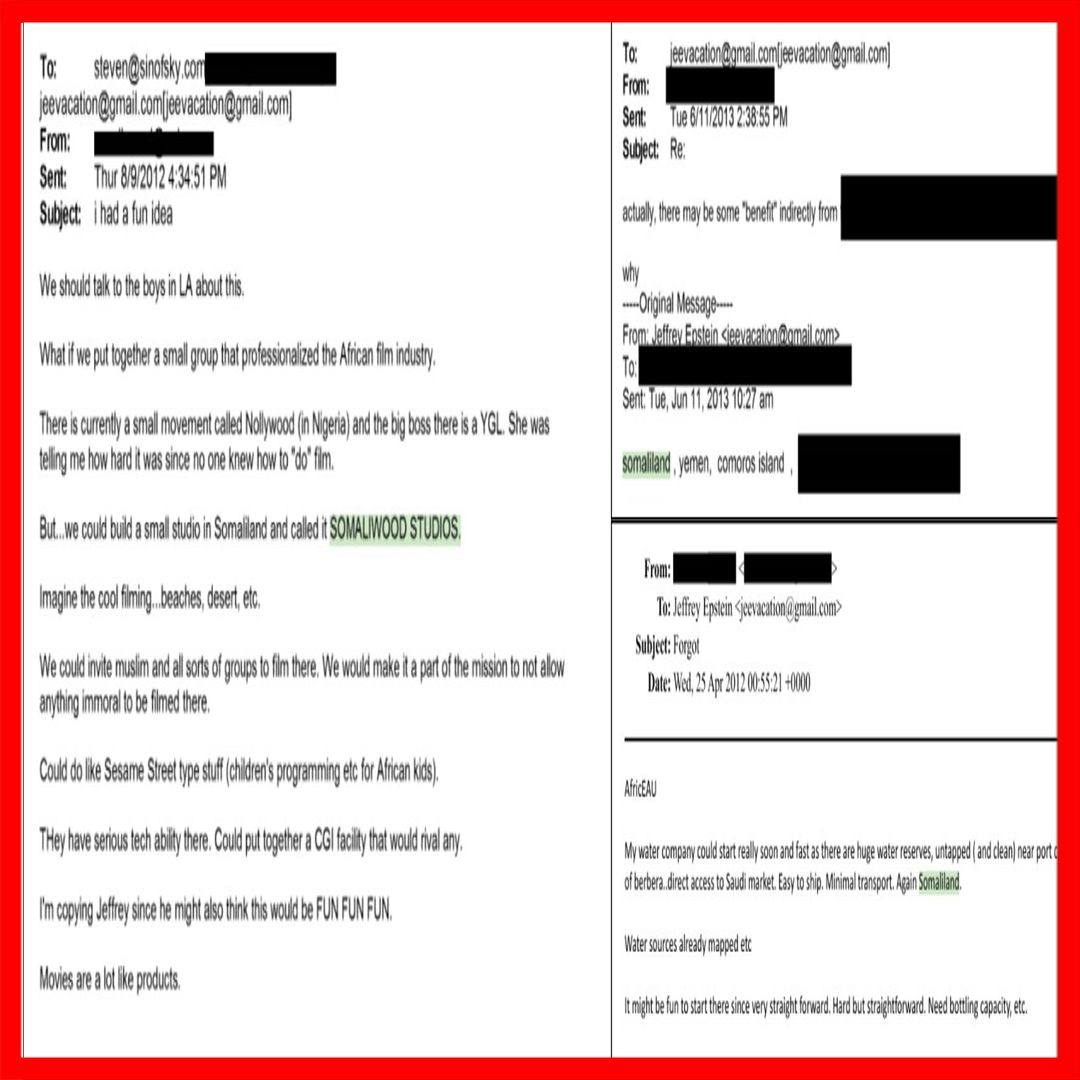 وخلال رسائل متعددة بين عامي 2012 و2018، ذُكرت أرض الصومال كفرصة استراتيجية وتجارية مرتبطة باستخراج المياه وامتيازات النفط وتأثير الإعلام والوصول للخليج. وفي إحدى الرسائل عام 2012، تطرق إبستين إلى فكرة إنشاء شركة مياه في أرض الصومال، مشيرًا إلى "احتياطيات ضخمة من المياه النظيفة غير المستغلة" قرب مدينة بربرة، واقترح أيضًا إنشاء مركز للأفلام والإعلام في أرض الصومال تحت اسم "استوديوهات سوماليوود". وفي عام 2013، أشار إلى امتيازات التنقيب عن النفط في أرض الصومال، مطالبًا بمبلغ 50 مليون دولار لتمويل ثلاثة مجالات تنقيب كبيرة تبلغ مساحتها حوالي 30 ألف كم مربع.
