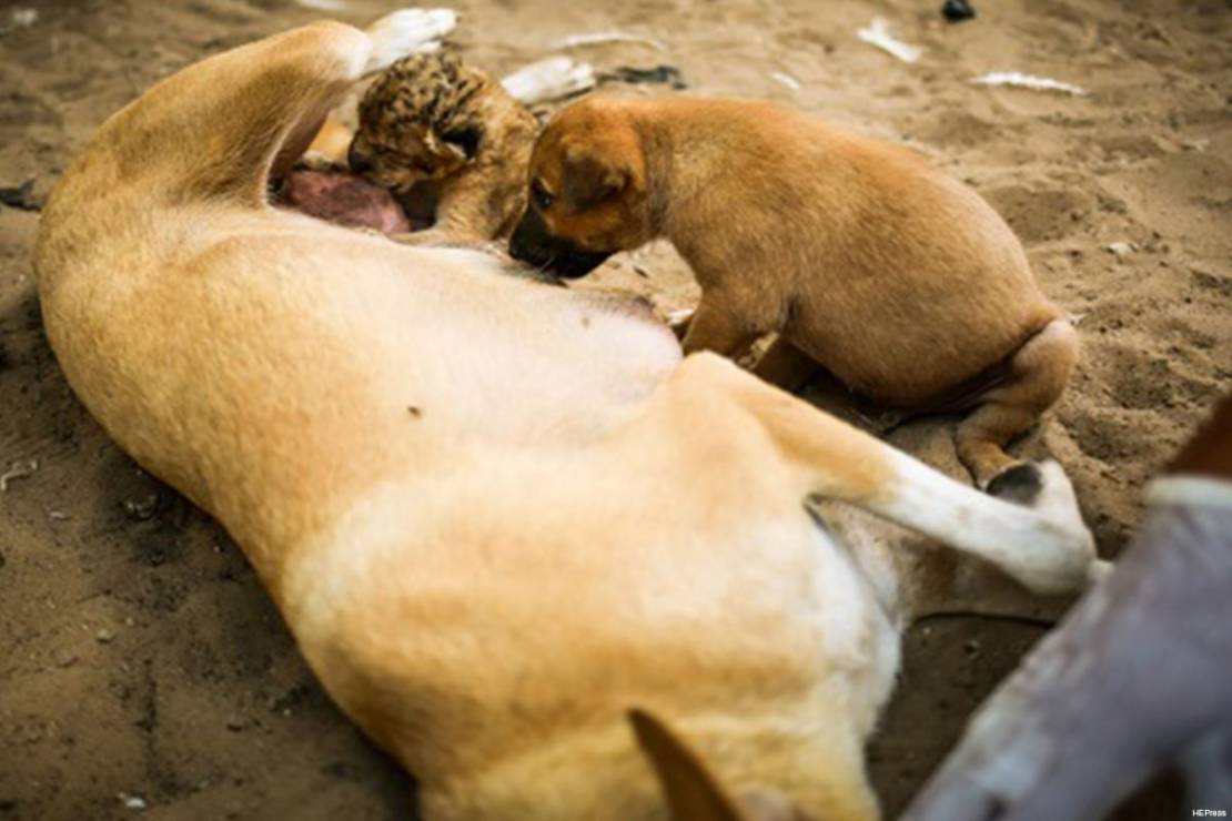 كلبة ترضع شبلا تركته أمه بحديقة حيوان في غزة